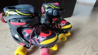 Se venden patines infantiles en color negro con detalles en rojo y amarillo. Son ideales para iniciarse en el patinaje. - Diseño de cuatro ruedas. - Cierre de cordones y velcro. - Ruedas de goma en color rojo y amarillo.