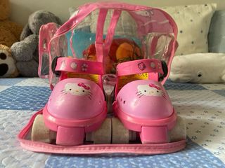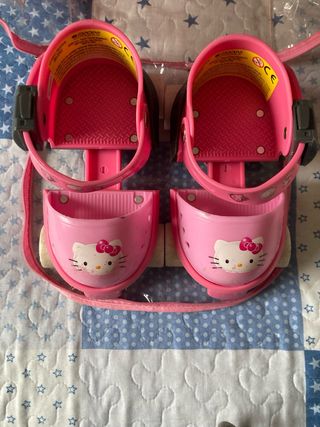 Patines infantiles iniciación para patinar con los zapatos puestos. Son los zapatos los que se introducen y se ajustan dentro de los patines. Se entregan en mochila de plástico divertido diseño de Hello Kitty en color rosa h bolsillos laterales. Mas cositas de niños en mi perfil. Hago lotes acumulando varias prendas para amortizar un único envío.