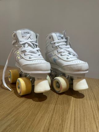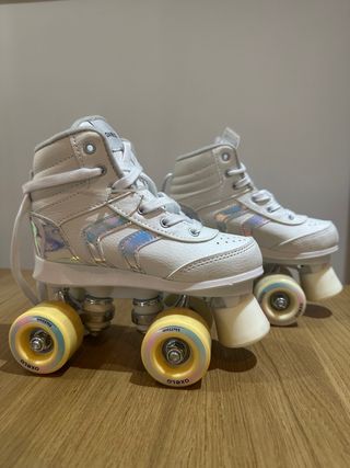 Patines infantiles de la marca Oxelo en muy buen estado. Son de color blanco con detalles iridiscentes en los laterales y ruedas de colores. - Diseño de bota alta. - Cierre con cordones. - Ruedas de 54x32mm. - talla 31