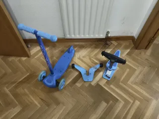 Patin infantil de tres ruedas con luces. Ideal para los más pequeños. - Ruedas de color naranja. - Manillar con puños naranjas. - Base azul y blanca. Precio negociable si se lleva algo de mi perfil