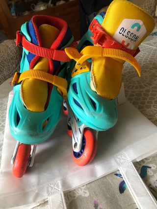 Patines infantiles de la marca Olsson en buen estado. - Diseño colorido y llamativo. - Cierres ajustables para mayor seguridad. - Ruedas de buen tamaño para deslizarse. Longitud: 22 cms