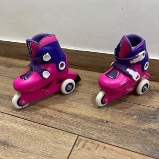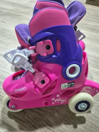 Patines infantiles Oxelo en color rosa y morado, ajustables para tallas de la 26 a la 28. Se trasforma en patines en linea. *mas patines y patinetes en mi perfil - Diseño llamativo con detalles. - Cierres de velcro y hebilla para un ajuste seguro. - Ruedas blancas.