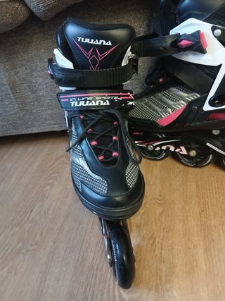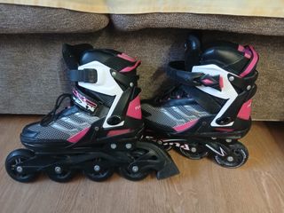 Patines en línea con un diseño deportivo y llamativo en colores rosa y negro. -Talla 37 -Muy poco uso - Cierre de velcro y hebilla. - Ruedas de poliuretano. - Bota acolchada para mayor comodidad.