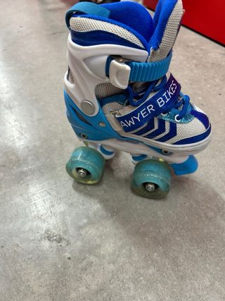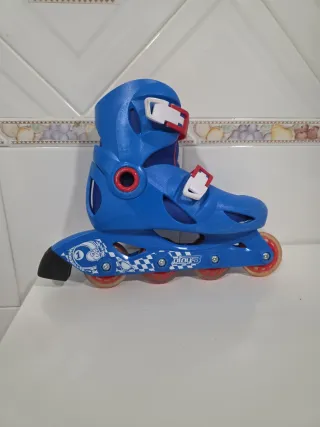 Se venden patines en línea para niños, con un diseño llamativo en tonos azules y amarillos. - Cierre con velcro y hebilla. - Ruedas de poliuretano. - Incluye bolsa de transporte negra. Talla 32-34