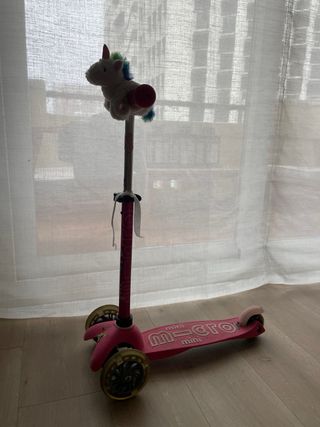 Patinete infantil Mini Micro Deluxe en color rosa. Cuenta con luces LED en las ruedas. - Modelo Deluxe. - Color rosa. - Ruedas con luces LED. - Peluche unicornio de regalo