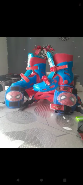 Set de patines infantiles con diseño de Spiderman. Incluye protecciones para mayor seguridad. - Talla ajustable para adaptarse al crecimiento. - Diseño con Spiderman. - Incluye rodilleras.