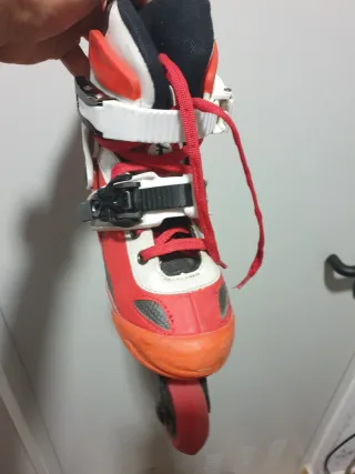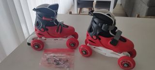 Se venden patines infantiles en color rojo y negro, ideales para aprender a patinar. Son ajustables para adaptarse al crecimiento del pie. - Talla regulable de la 27 a la 30. - Cierre de velcro y hebilla para un ajuste seguro. - Ruedas combinables en linea o paralelo. - Incluye herramientas para cambio de ruedas. - Incluye rodilleras, coderas y protección para las muñecas. Usados pero en buen estado. Para recoger en el Ensanche de Vallecas o envío.