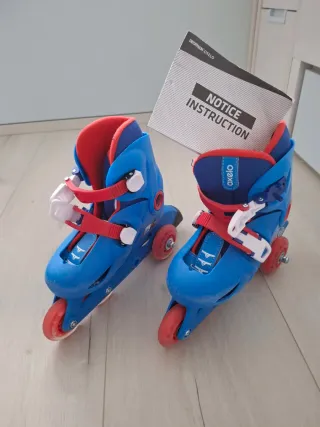 Set de patines infantiles de la marca Oxelo, ideales para los más pequeños (talla 28-30). Son ajustables para adaptarse al crecimiento. - Color azul y rojo. - Cierre con velcro y hebilla. - Ruedas de color rojo (se pueden poner en línea o una rueda delante y dos detrás para ganar estabilidad). Incluye el kit de estabilizacion para cambiar la disposición de las ruedas. Lo ha usado 5 veces.