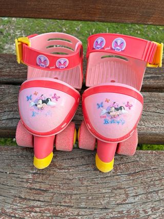 Patines ajustables de color rosa con diseño de Minnie Mouse. Perfectos para los más pequeños que se inician en el patinaje. - Diseño con Minnie Mouse y mariposas. - Cierre de velcro y hebilla. - Ruedas dobles para mayor estabilidad.