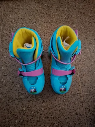 Patines infantiles con diseño de Peppa Pig. Son ajustables para adaptarse al crecimiento. - Color azul y amarillo. - Cierre de velcro y hebilla. - Ruedas de plástico. Talla 30 se pueden hacer mas grandes o mas pequeños Usados en 3 ocasiones