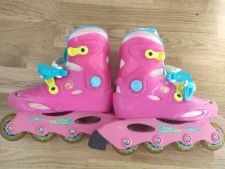 Patines en línea de color rosa para niña o niño, ajustables en talla de la 32 a la 34. Incluyen herramientas para su ajuste en posición de estabilidad. - Diseño infantil. - Cierre de velcro y hebilla.