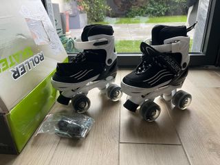 Se venden patines infantiles en color negro y blanco. Son ideales para iniciarse en el patinaje. - Cierre de velcro y cordones. - Ruedas de poliuretano. - Incluye kit de herramientas.