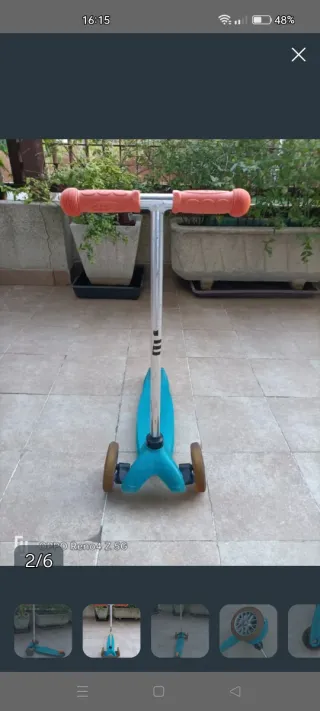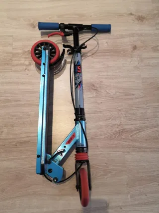 Patín infantil Oxelo en color azul con detalles en rojo. - Manillar con puños azules. - Ruedas de color rojo. - Freno en la rueda trasera. - Plegable para facilitar su transporte. -Casi sin usar