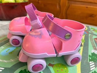 Patines infantiles de color rosa, ideales para aprender a patinar. La talla es ajustable. - Talla aproximada: 24-30. - Diseño con flores. - Cierre de velcro.