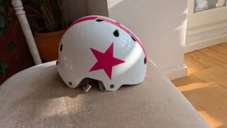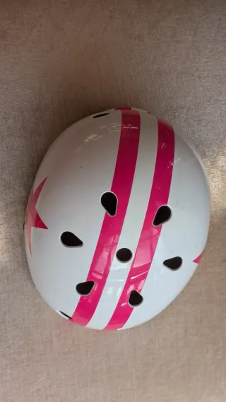 Casco infantil con un diseño divertido de estrellas y rayas rosas sobre fondo blanco. Ideal para patinar o montar en bicicleta. - Diseño de estrellas rosas. - Rayas verticales rosas.