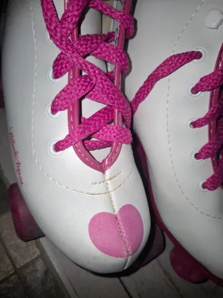 Patines infantiles en color blanco con detalles rosas, talla 36. Perfectos para iniciarse en el patinaje. Se encuentran un pelin despegado tal y como se ve en la foto. Pero se puede arreglar con un poco de pegamento. - Diseño con corazón rosa en la puntera. - Cordones rosas. - Ruedas rosas.