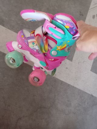 Patines de estilo quad con un divertido diseño de unicornios y arcoíris. Aunque en la talla pone 34/37 son más pequeños. Nuevos sin estrenar. - Ruedas de PU de 54mm/32mm. - Rodamientos ASEC-7. - Sistema de cierre con hebilla. - Talla expandible.