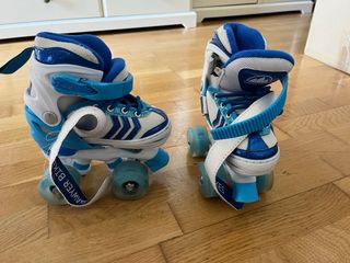 Precio ajustado esta semana para venta. Patines de 4 ruedas para niños/as, ideales para iniciarse. Muy estables y cómodos, con bota acolchada, cordones + cierre de seguridad. Ruedas en buen estado, funcionan perfectamente. Uso normal de niño/a, bien cuidados. Colores rosa/blanco/azul, tal como en las fotos.