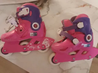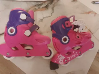 Patines en línea para niñas, en color rosa y morado. Están en buen estado y son ideales para principiantes. - Dos patines en línea. - Talla: consultar la talla exacta en las fotos. - Color rosa y morado. - Diseño cómodo y ligero. Se pueden poner en 3 rueda para su mejor aprendizaje.