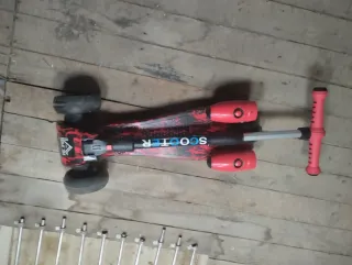 Patín de tres ruedas en llamativos colores rojo y negro, diseñado para niños. Lleva bluetooth luces en las ruedas al andar y echa humo por atrás por las dos turbinas está en buen estado costo nuevo 70 - Diseño con estampado. - Ruedas de goma. - Manillar ajustable.