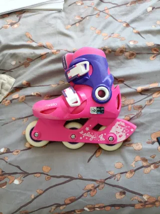 Patines en línea ajustables Oxelo Play 3 en color rosa y morado. Decathlon. En perfecto estado. Las ruedas se pueden colocar en línea o 1 delante y 2 ruedas juntas atrás como se ve en las fotografías. Ideal para iniciarse y aprender. - Talla regulable de 26 a 28. - Diseño infantil con ruedas. - Cierre de velcro y hebilla.