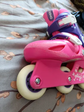 Patines infantiles Oxelo Play3 en color rosa y morado. - Talla ajustable de 26 a 28. - Diseño con estrellas y personaje. - Marcas de uso que se ven en las fotos. - Buen estado del freno.