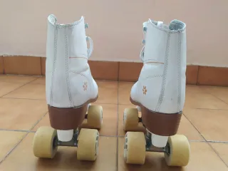 Patines clásicos de iniciación en muy buen estado, con marcas leves de uso normales pero totalmente funcionales. Perfectos para empezar a patinar o para clases recreativas. ✔️ Bota Risport talla 230 (equivale aprox. a un 35–36 EU) ✔️ Ruedas y frenos en buen estado Incluyo fundas y desodorizante de regalo
