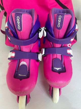Patines en linea Oxelo, adaptables entre la talla 32 y 35. Se han usado bastante pero aún pueden servir unos años más o como patines de iniciación. Los cierres están bien y no tiene rodamientos en mal estado.
