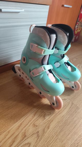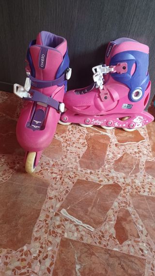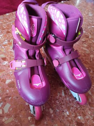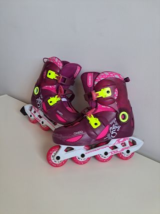 Patines Oxelo en color rosa y verde lima, ideales para niñas. Están en buen estado y son perfectos para iniciarse en el patinaje, usados un par de veces, lo único que tiene son la típica rozadura de cuando la niña aprende a patinar. Las protecciones están nuevas solo usadas una vez para probarlas. - Talla ajustable 30-32 - Cierre con hebilla - Diseño cómodo y ligero - Protecciones: rodilleras, coderas y muñequeras.