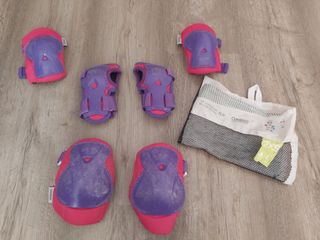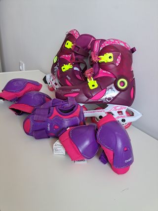 Patines Oxelo infantiles, en color morado y rosa, con un diseño juvenil y moderno. Están en buen estado, con algunas señales normales de uso. Se incluyen también las protecciones a juego, para mayor seguridad. - Patines Oxelo ajustables. - Protecciones: rodilleras, coderas y muñequeras. - Color morado y rosa.