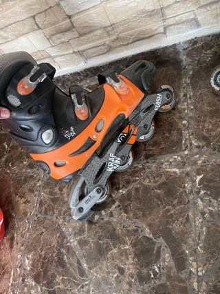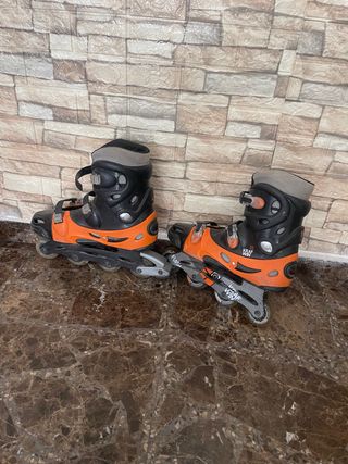 Patines en línea para niños, en buen estado. Ideales para principiantes. - Color naranja y negro. - Sistema de cierre con hebillas. - Ruedas en buen estado. - Talla 45 -Tienen poco uso -precio negociable