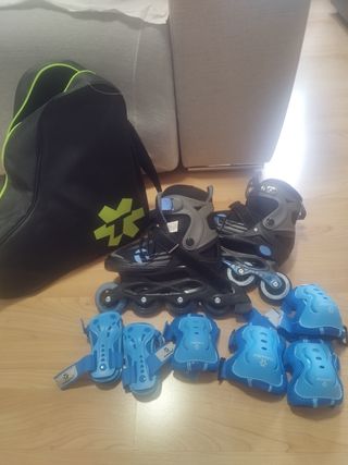 Patines en línea para niños, en buen estado. Incluye bolsa de transporte y protecciones. - Patines ajustables. - 2 protectores de rodillas. - 2 protectores de codos. - 2 protectores de muñecas. - Bolsa para transportar los patines.