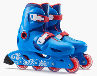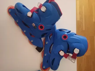 Patines en línea de color azul y rojo, ideales para niños. Cuentan con un sistema de ajuste para adaptarse al crecimiento. - Talla ajustable: 30-32. - Cierre con hebilla. - Ruedas de poliuretano.