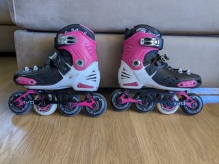 Patines en línea Powerslide, rosas y blanco. Están prácticamente nuevos y en perfecto estado. - Talla: 35-38 - Color: Rosa y blanco