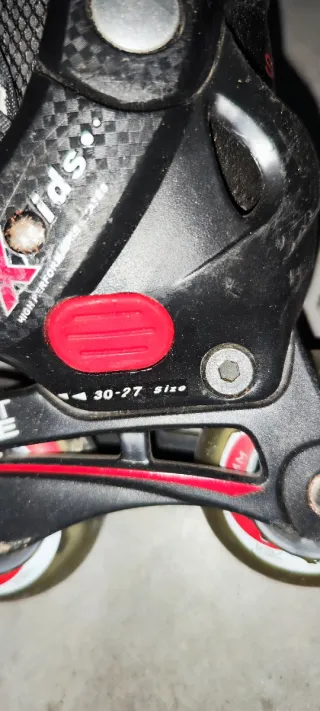 Patines en línea ajustables para niños, talla 27 a 30. Perfectos para iniciarse en el patinaje. - Diseño en negro con detalles en rojo y blanco. - Cierre de velcro y hebilla para un ajuste seguro. - Ruedas de poliuretano.