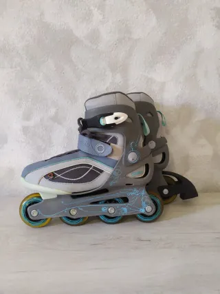 Patines de la marca Oxelo. - Diseño en color gris y azul. - Cierre de velcro y hebilla. - Ruedas negras. se le quedaron peques a la niña y nos haría ilusión que los aprovechara alguien. Estan bien conservados. Urge vender! sería para venir a buscarlo a Badalona