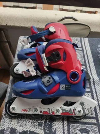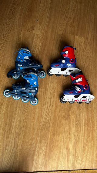 Se venden dos pares de patines en línea para niños. Ideales para iniciarse en el patinaje. - Un par de patines azules. Talla 30-33( Tijuana ) - Un par de patines rojos y azules. Talla 28-30( Oxelo ) - Ruedas de poliuretano. - Los de la marca Tijuana se expanden de la talla 30-33 presionando un botón. - Están en muy buen estado - Se venden juntas. Son dos pares en tallas consecutivas: una talla más que la otra.