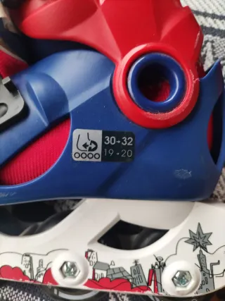 Patines de Spiderman para niños, con un diseño llamativo en azul y rojo. - Ajustables para adaptarse al crecimiento. - Cierres de seguridad. - Ruedas resistentes.