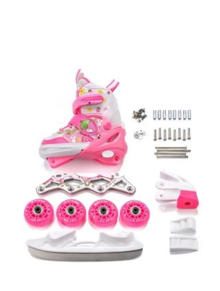 Set de patines 4 en 1 para niños, talla ajustable de la 30 a la 33. El diseño es rosa con divertidos dibujos. - Incluye todos los accesorios para las 4 configuraciones. - Ruedas de color rosa. - Cierre de velcro y hebilla para un ajuste seguro.