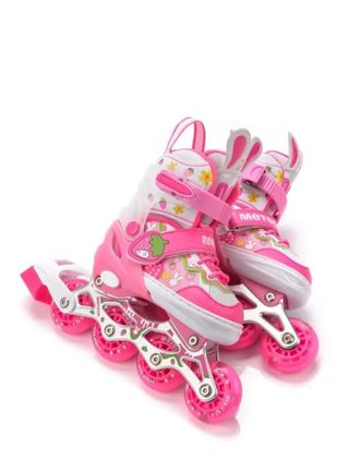 Conjunto de patines en línea para niños en color rosa,mochila para transportarlos. - Diseño ajustable para mayor comodidad. - Cierre de velcro y hebilla para un ajuste seguro. - Ruedas resistentes para un deslizamiento suave.