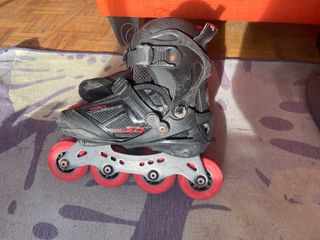 PATINES PARA NIÑAS Y NIÑOS. CON BOLSA PARA GUARDAR LOS PATINES MARCA OXELO. COLOR: Negro con detalles en rojo. TALLA: 32-34. USO: Ideales para la iniciación en el patinaje. CIERRE: Cuentan con un sistema de cierre que combina velcro y hebilla para un ajuste seguro.