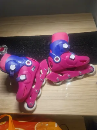 Patines en línea de color rosa. Cuentan con un sistema de ajuste para adaptarse al crecimiento. Talla 28-30. - Diseño ajustable. - Ruedas resistentes. - Cierre de velcro y hebilla. Vendo también las protecciones. Precio nuevo: 24,99€