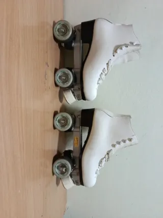 Patines artísticos de la marca Oxelo, diseñados para niños y mujeres. Son de color blanco con detalles en rosa. Nr 37. De Decathlon. Precio original 49.99€. Los vendo por 14€. - Diseño artístico. - Cierre con cordones. - Ruedas de 4 puntos.