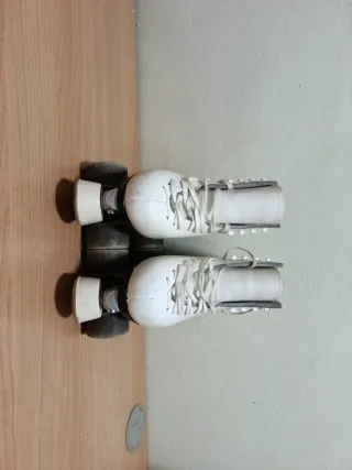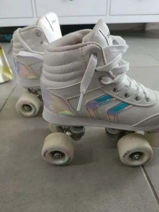 Patines niña altos de Decathlon en color blanco, talla 34. Perfectos para iniciarse en el patinaje. - Diseño moderno con detalles iridiscentes. - Cierre con cordones para un ajuste seguro. - Ruedas resistentes para un deslizamiento suave. Son justitos de talla, mejor para tallas más pequeñas del 34. Mi hija los ha usado muy poquito