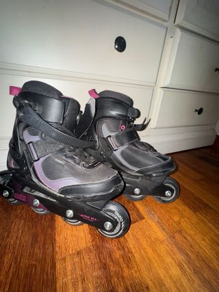 Patines Rollerblade extensibles, ajustables en 4 tallas, desde la 33 hasta la 36,5. Tienen marcas de uso, pero están en perfecto estado. Funcionan correctamente y se entregan con su caja original.