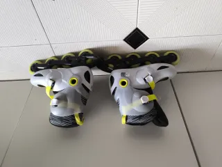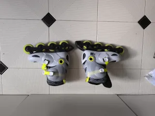 Par de patines en línea para niños, talla 32-34. Diseñados para ofrecer estabilidad y comodidad. - Color gris con detalles en amarillo. - Cierre de velcro y hebilla. - Ruedas de poliuretano. Prácticamente nuevos