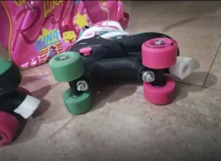 Patines en buen estado para niña, talla 32-34. - Color rosa y verde. - Cierre con hebilla y velcro. - Ruedas en buen estado.