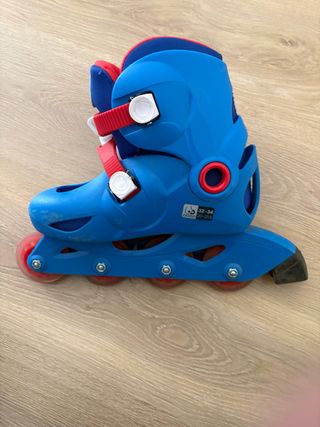 Se venden patines en línea de color azul y rojo, ideales para iniciarse en el patinaje. - Talla ajustable de 28 a 30. - Cierre con velcro y hebilla. - Ruedas de poliuretano.
