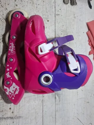 Se venden patines rosas para niños, con un diseño divertido y ajustable. - Talla ajustable de 26 a 28. - Cierre de velcro y hebilla para mayor seguridad. - Ruedas resistentes para un deslizamiento suave.
