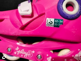 Patines en línea para niña, ajustables en talla de la 29 a la 32. Diseñados con un atractivo estampado de círculos rosas sobre fondo blanco y gris. - Ajuste de talla: 29 a 32. - Diseño infantil con círculos rosas. - Cierre fácil Softmax. Cordones Tienen marcas de uso pero el interior está muy bien y las ruedas también